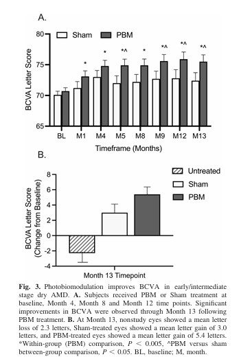Die Photobiomodulation (PBM) ist die bisher einzige Therapieoption bei trockener altersabhängiger Makuladegeneration, die einer klinischen Studie (die "Lightsite Study") zu einer Sehkraftverbesserung geführt hat und wurde deshalb zur Behandlung von der staatlichen US- amerikanischen Zulassungsbehörde "FDA" authorisiert. Hier das Info-Video und ein Auszug aus der Originalstudie.