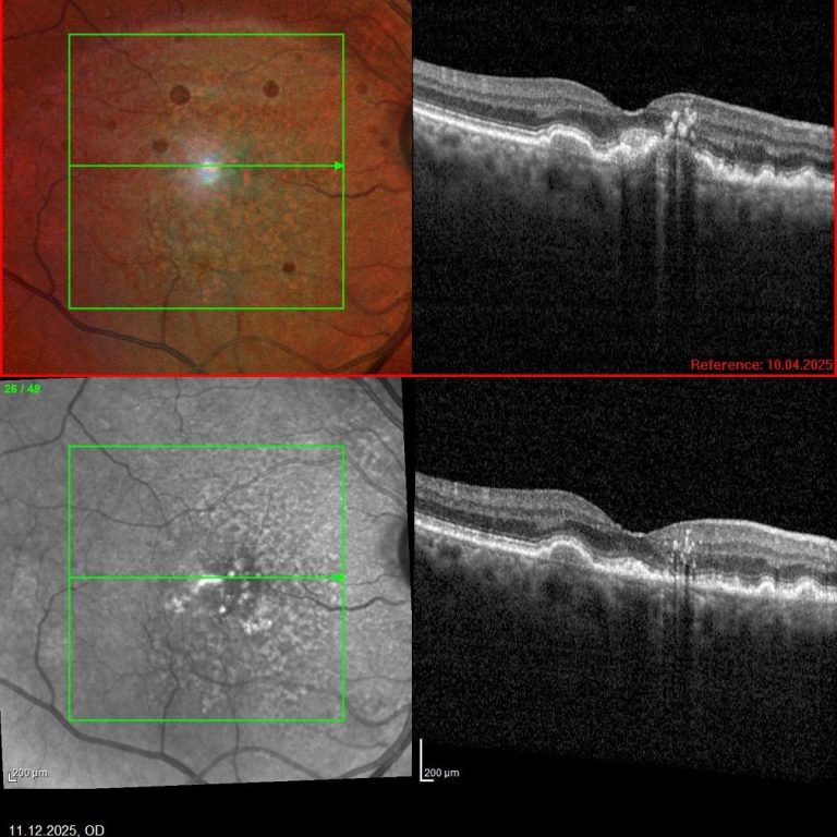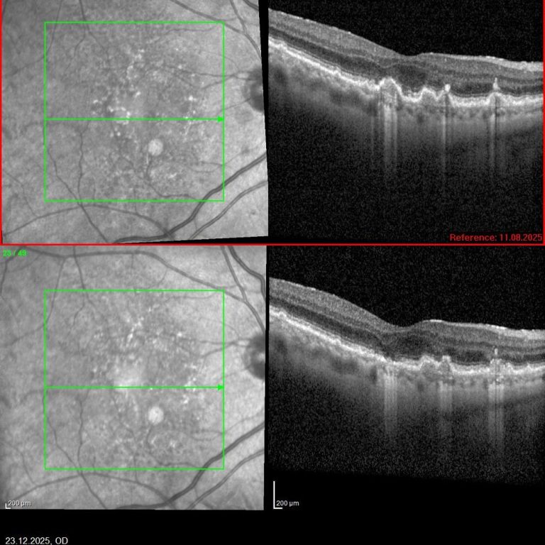 Auf der linken und rechten Seite sehen wir den jeweils gleichen Schnitt durch die Netzhaut an unterschiedlichen Zeitpunkten (links nach etwa 4, rechts nach etwa 8 Monaten) unterschiedlicher Patienten nach 9 Sitzungen Photobiomodulation (PBM). Der therapeutische Effekt mit Reduktion der Ablagerungen (Drusen) unterhalb der Netzhaut und retinalem Pigmentepithels zeigt sich rechts wie links.