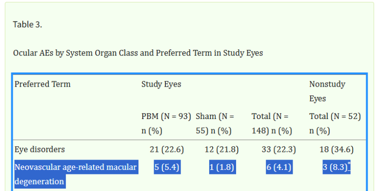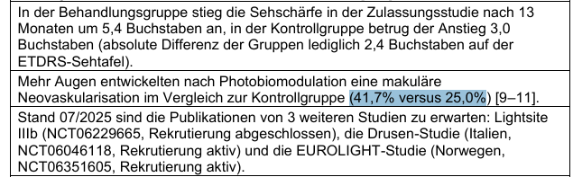 Es gibt hierzu auch eine Stellungnahme der DOG, der retinologischen Gesellschaft und des Berufsverbandes der Augenärzte, die aber u.a. von Zahlen für das Risiko der unerwünschten Entwicklung einer feuchten Makuladegeneration nach PBM ausgeht (41,7% PBM vs 25 % Sham/Kontrolle), die so nicht aus der genannten, einzigen klinischen Studie (s.o.) hervorgehen (eigentlich: 5.4 % PBM vs. 1,8% Sham/Kontrolle). Die damit verbundene Warnung vor der PBM ist daher aufgrund der aktuellen Datenlage nicht objektivierbar.